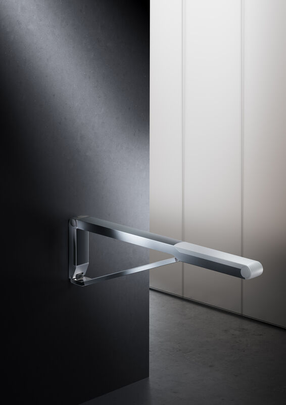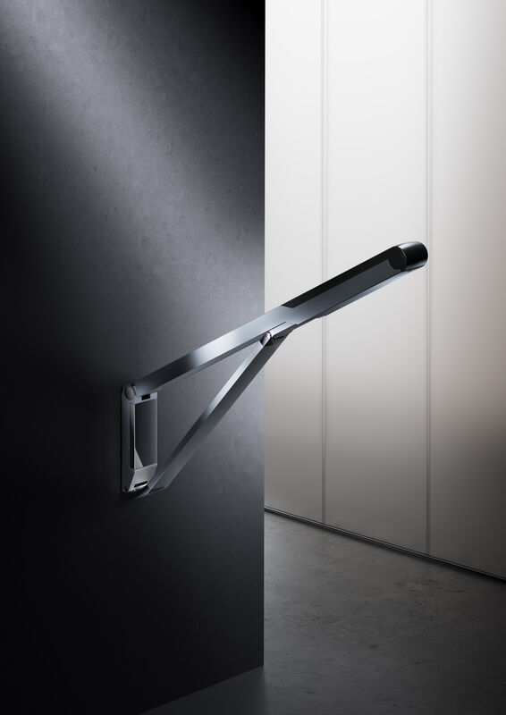 Besonderes Highlight der Serie ist der Stützklappgriff: hochgeklappt steht er einzigartig flach und unauffällig an der Wand. Beim Hochklappen schieben sich die Profile des Stützklappgriffs auseinander. So ergibt sich an der Wand die einzigartig flache, elegante und nahezu skulptural anmutende Optik.